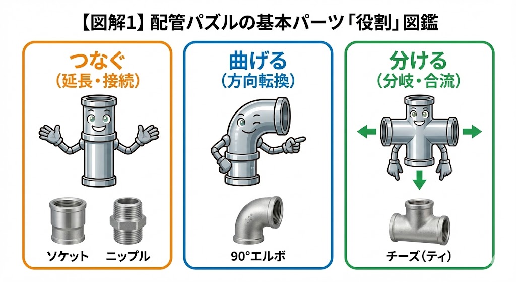 配管のパーツは星の数ほどありますが、「何をするための部品か?」という役割で分けると、実はとてもシンプルです。