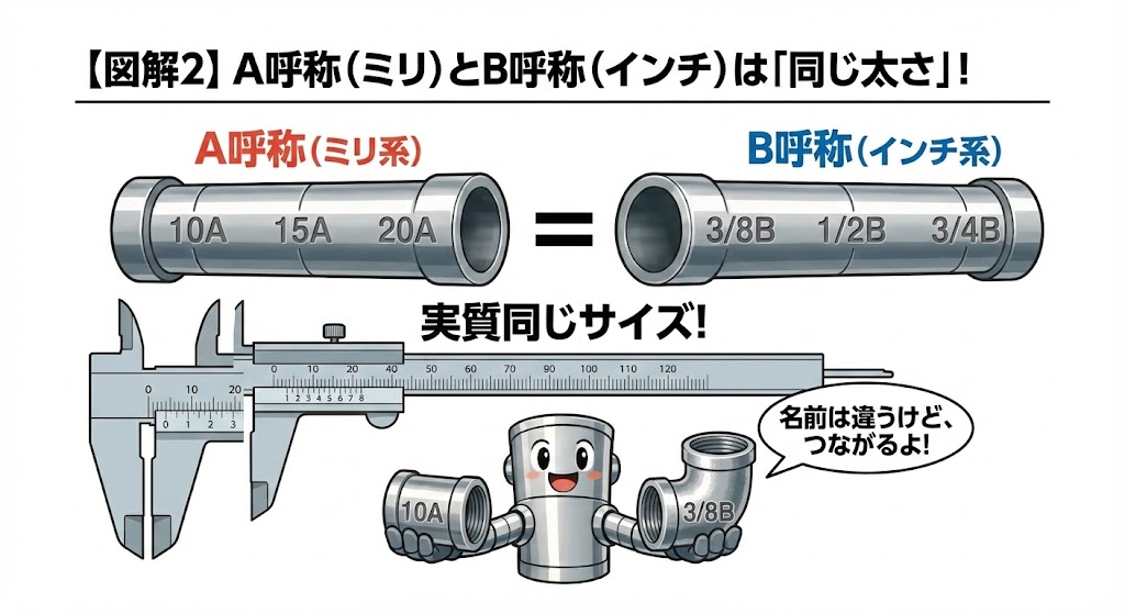 | A呼称 (ミリ系) | B呼称 (インチ系) | 現場での俗称・ 読み方のヒント |