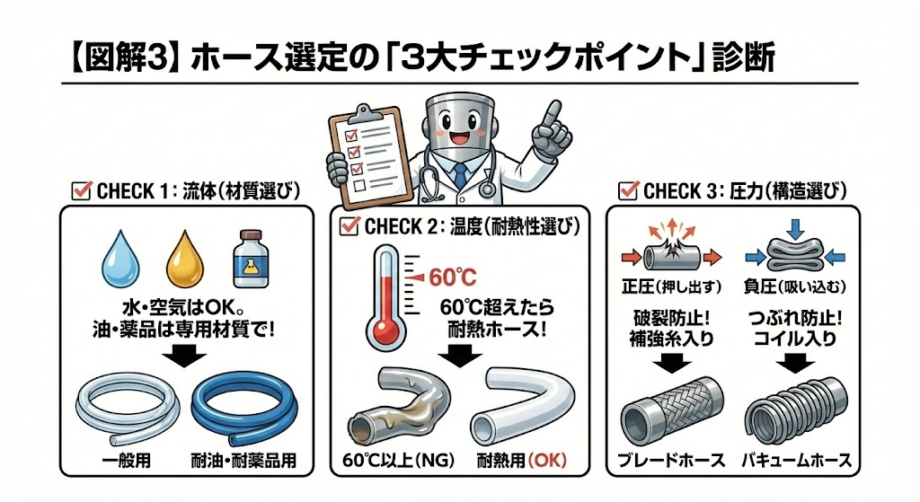 配管(金属管や塩ビ管)と違って、柔軟な「ホース」を選ぶ際はさらに注意が必要です。