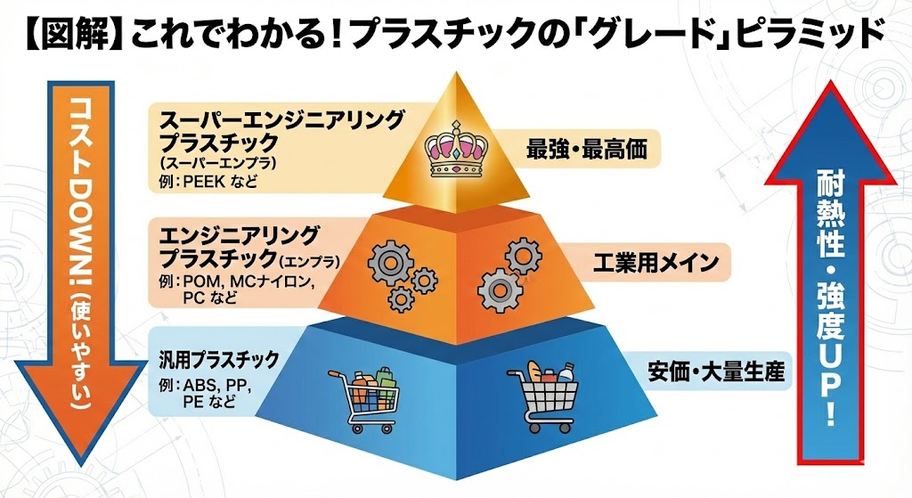 - スーパーエンプラ: 200℃以上の熱や過酷な薬品にも耐える最高峰(PEEKなど)。