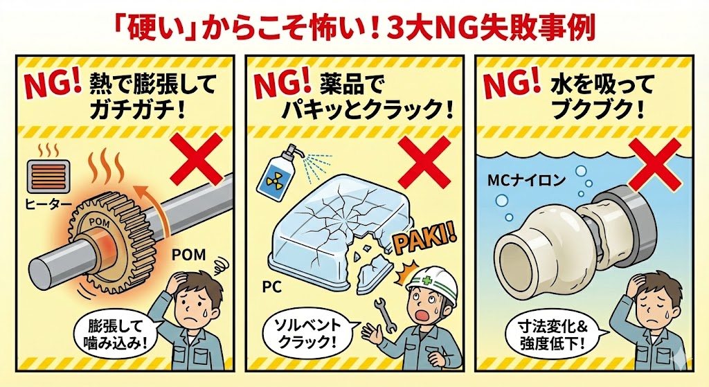 - 水を吸ってブクブク!:ナイロンなどは湿気を吸うだけで膨らみます。「精密な寸法」が必要な場所にナイロンは禁物です。