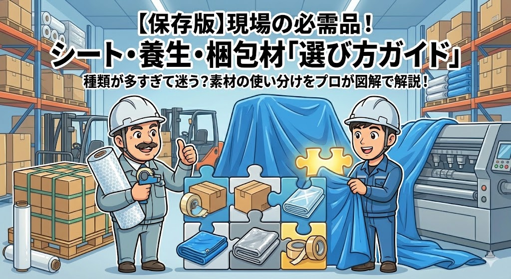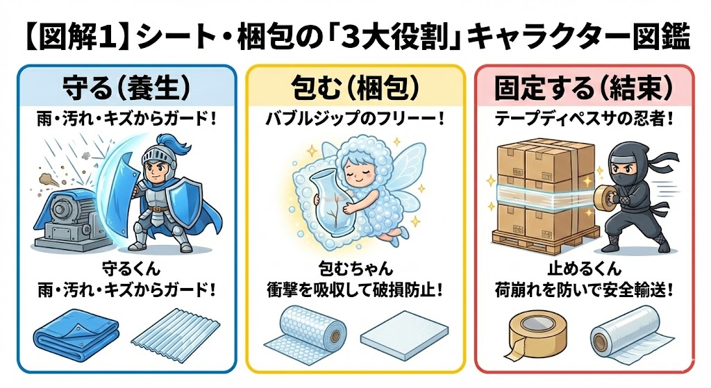 この記事では、シート・養生・梱包材の基本から、失敗しないための選び方のポイントを、キャラクターと一緒に楽しく解説します。