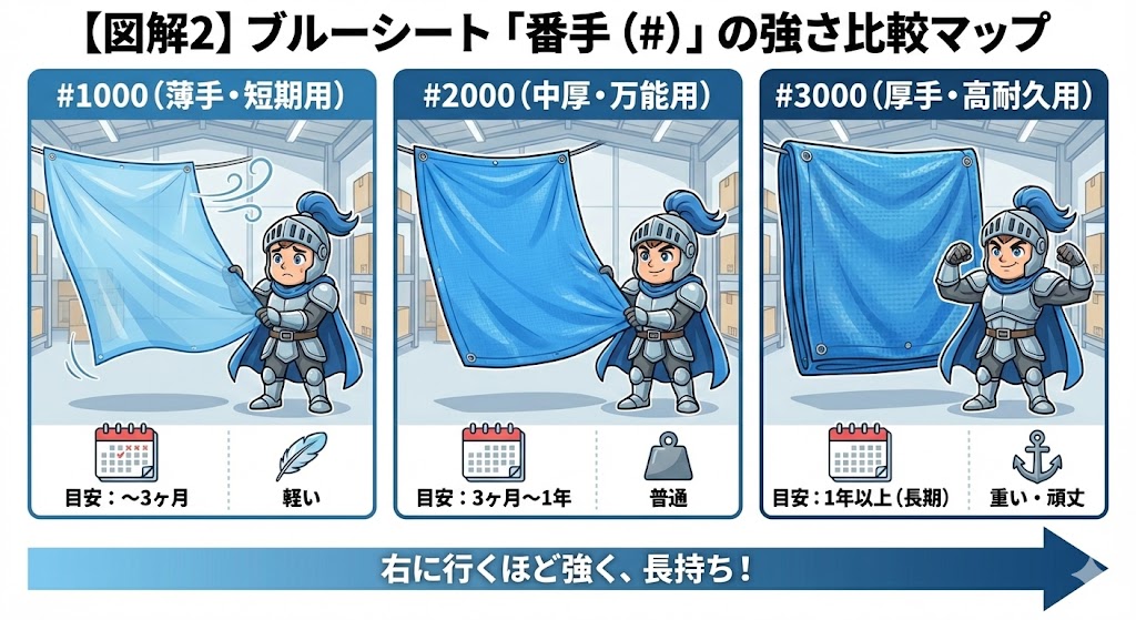 3.【図解2】ブルーシート「番手(#)」の強さ比較マップ