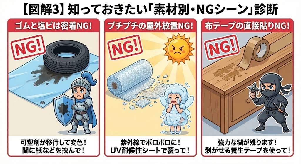 「とりあえずブルーシートで」「余っているテープで止めておこう」……そんな選び方で、大切な製品や現場を傷つけていませんか?