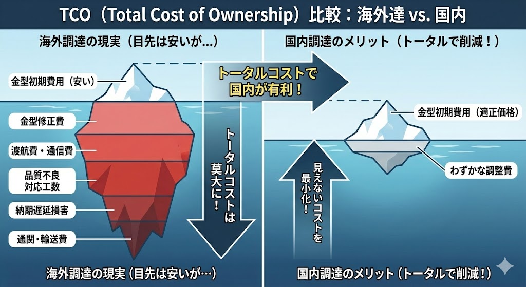 いかがでしょうか。多くの企業が注目するのは、水面上に見えている**「金型初期費用」**だけです。確かに、海外の金型費は国内よりも安く見えるでしょう。
