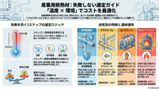 産業用断熱材(グラスウール・ロックウール・発泡樹脂・セラミックファイバー)の違いと選び方を解説。温度・湿気・用途から最適材質を判断し、結露・劣化・エネルギーロスを防ぐ方法が分かります。