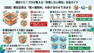 梱包で破損・クレームを防ぐ方法を解説。箱サイズの選び方、プチプチの正しい使い方、コストを下げる梱包設計までプロが分かりやすく解説します。