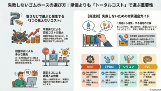ゴムホースは用途に合わない選定で劣化・漏れ・交換コストが増加します。本記事では水・油・高温など用途別の最適材質(NBR・EPDM・シリコン・PVC)と、見えないコストを含めた正しい選び方を解説します。